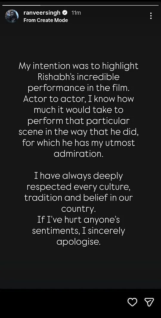 Sharing a story on Instagram on Tuesday, Singh clarified his intentions, stating, “My intention was to highlight Rishabh's incredible performance in the film. Actor to actor, I know how much it would take to perform that particular scene in the way that he did, for which he has my utmost admiration.”